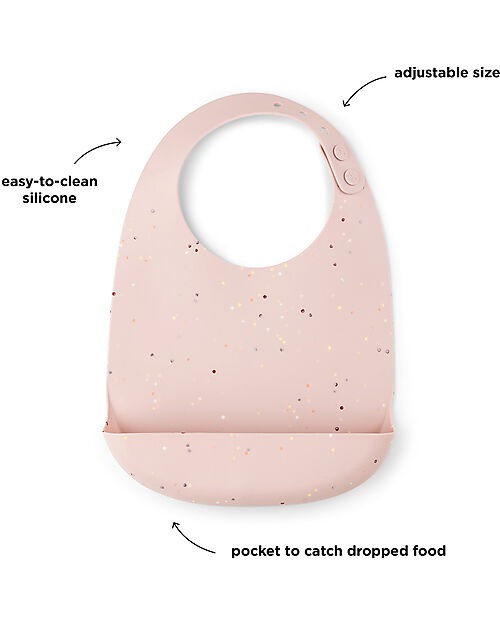 Rendi i pasti meno disordinati con un pratico bavaglino in silicone con coriandoli. È facile da pulire e con una tasca intelligente per raccogliere il cibo che cade ti farà risparmiare un sacco di tempo per la pulizia.