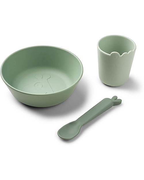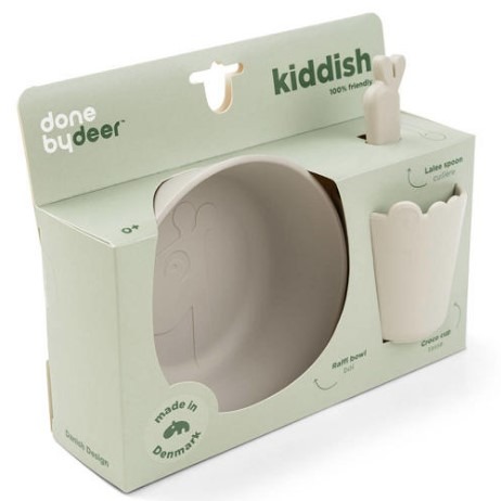 Il primo set per la pappa, non si scorda mai! Done by Deer celebra i primi momenti a tavola con mamma e papà con il set Kiddish first meal, comprendente una ciotola, una tazza e un cucchiaio della collezione Kiddish, realizzato con materiale riciclabile con la plastica, per dare vita in un secondo momento a nuovi oggetti. Ottima idea regalo!