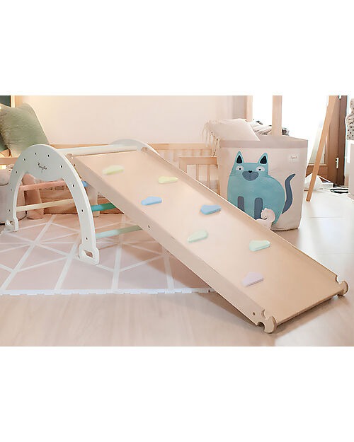 Ideale come complemento agli Archi Montessoriani Rainbow, questo scivolo-rampa è più di un semplice giocattolo: è un regalo perfetto per sorprendere i piccoli esploratori e offrire loro un universo di stimoli e opportunità.