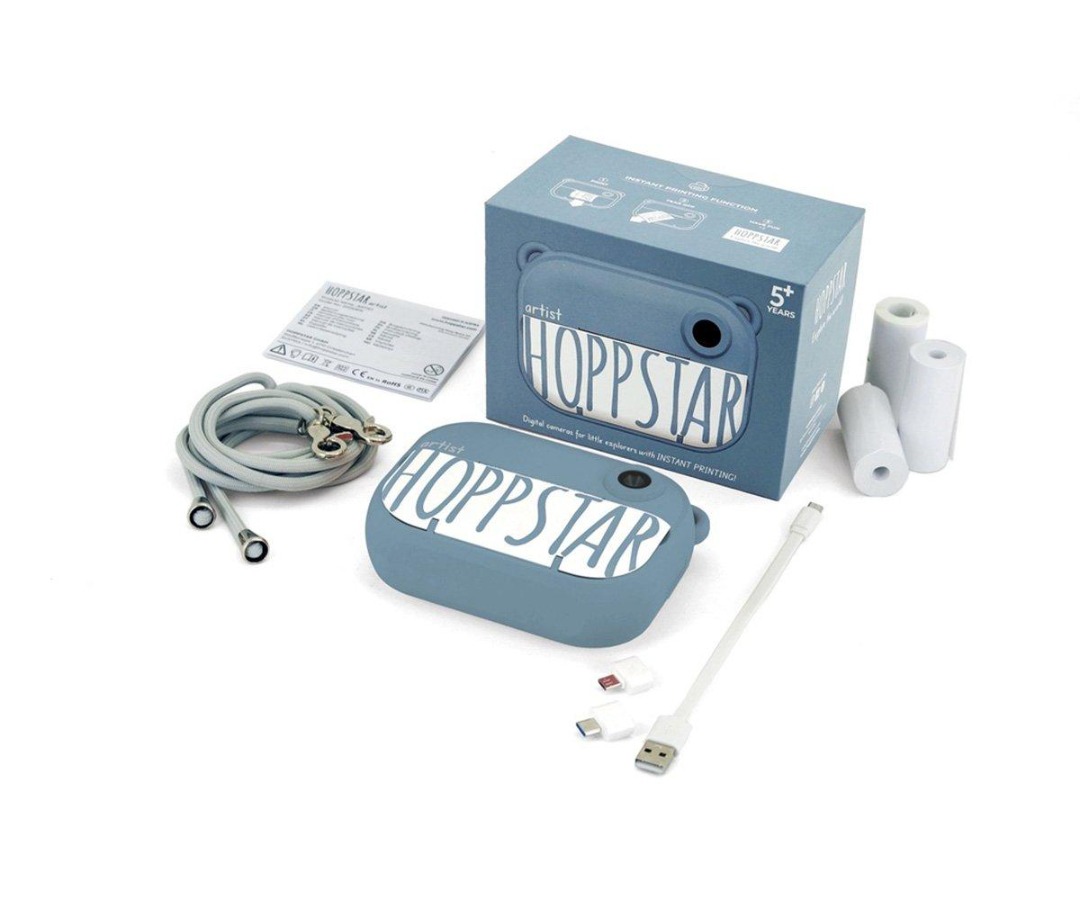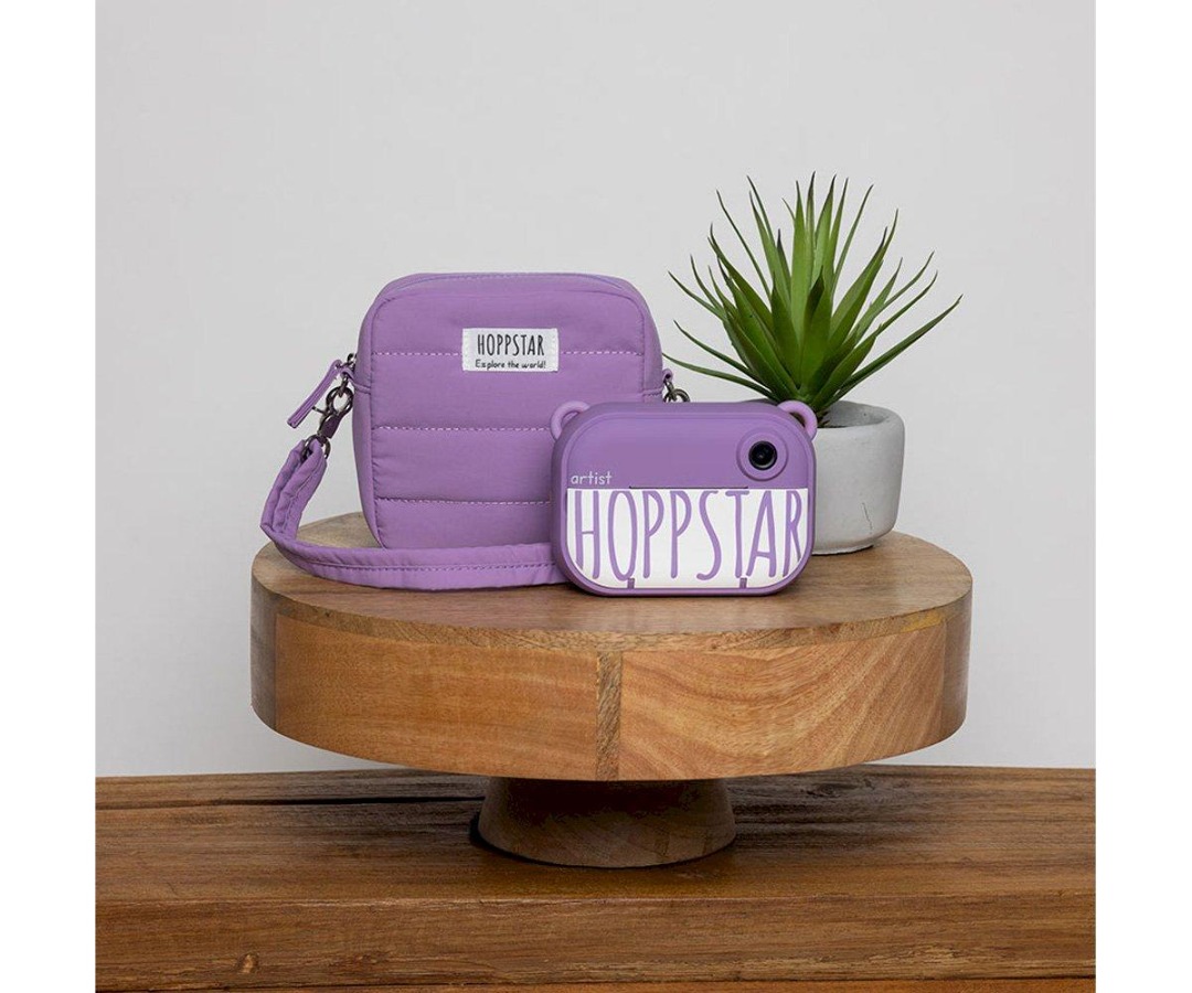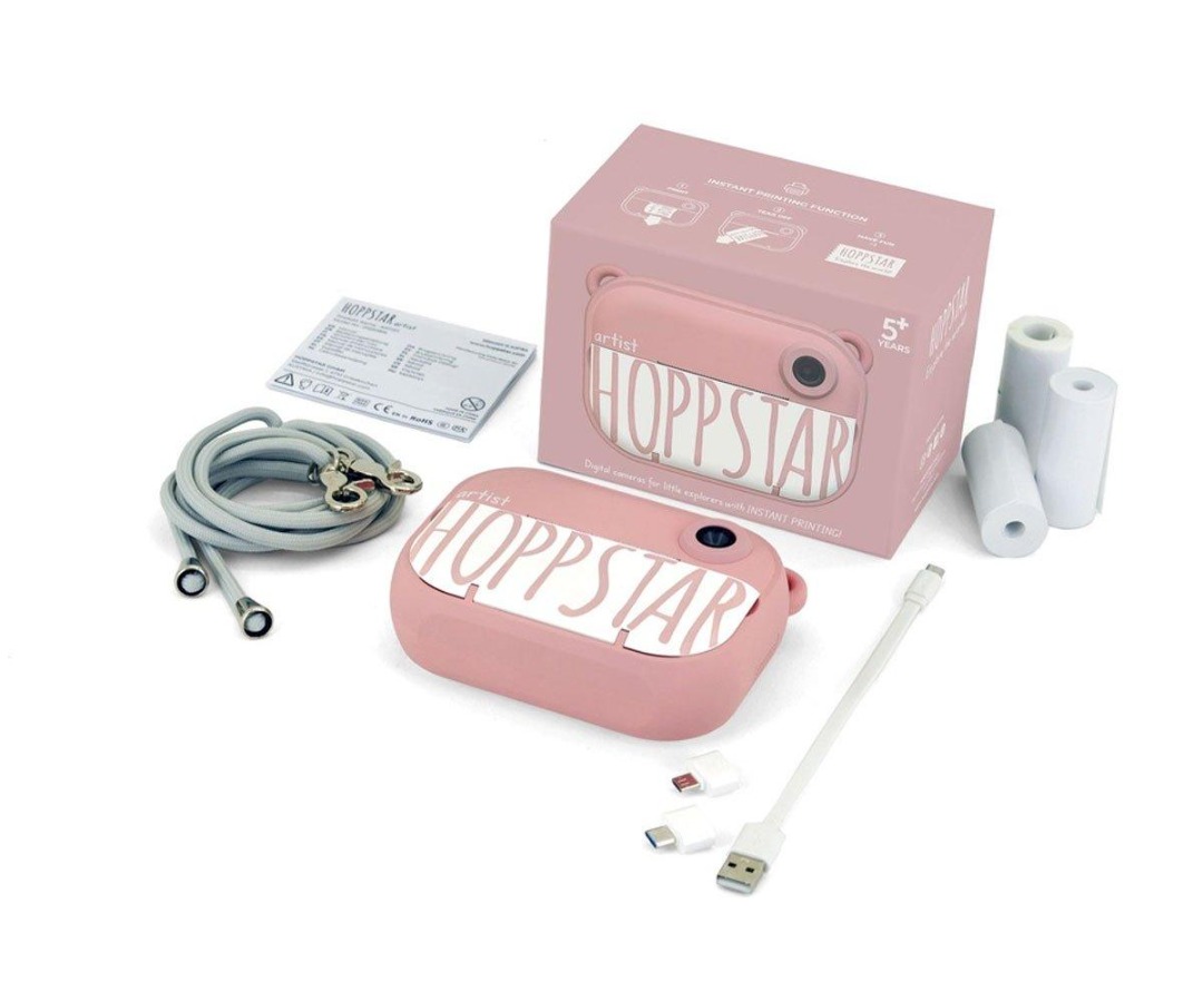Fotocamera digitale Hoppstar Artist MEMO a stampa istantanea che supporta schede microSD fino a 32 GB ed è in grado di trasferire foto in modalità wireless.