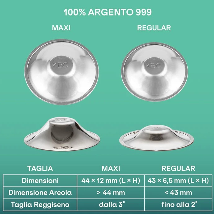 Disponibili in due versioni (100% argento e trilaminato), sono anatomiche, discrete sotto i vestiti e si adattano a ogni seno grazie alla possibilità di scegliere tra due diverse taglie (Regular e Maxi).