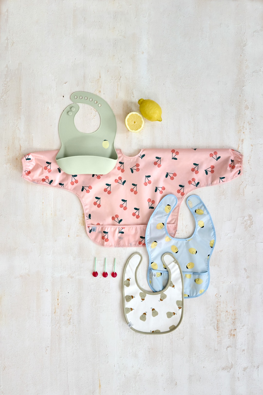 I bavaglini a maniche lunghe si abbinano perfettamente alle stoviglie e ad altri prodotti della collezione Happy Fruits.