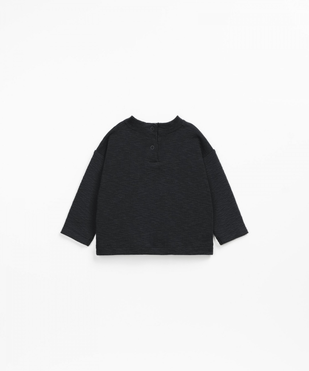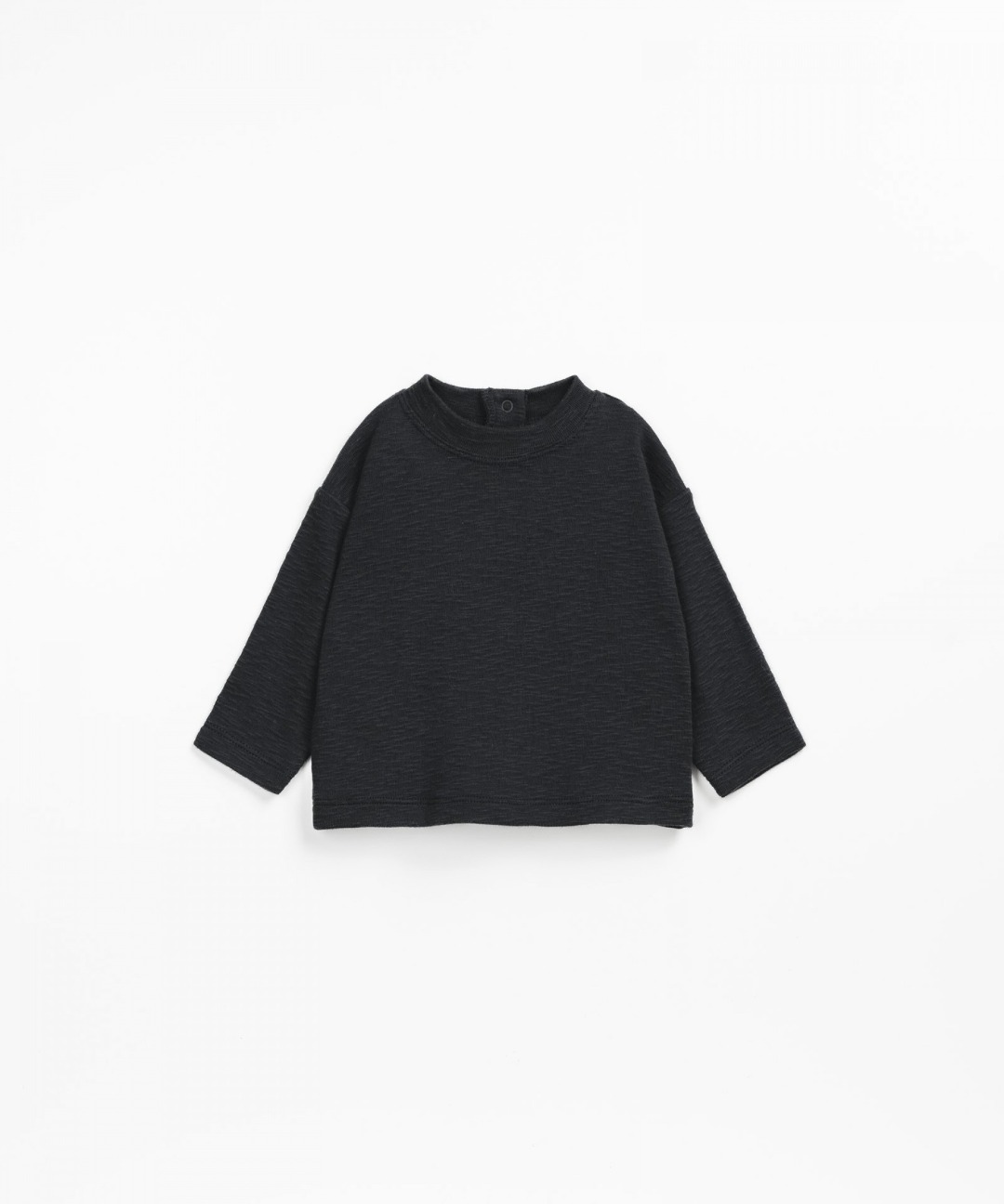 T-shirt realizzata in maglina di cotone biologico, colore Penguin. È un modello a manica lunga, collo rotondo, mezzo collo e apertura sulla schiena con molle in metallo senza nichel.