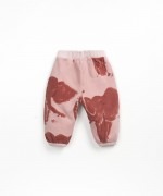 Pantaloni confezionati in maglina misto cotone biologico e cotone, colore Memories. Modello con cintura elastica, cordoncino decorativo, caviglie elasticizzate e la nostra stampa a elefanti.