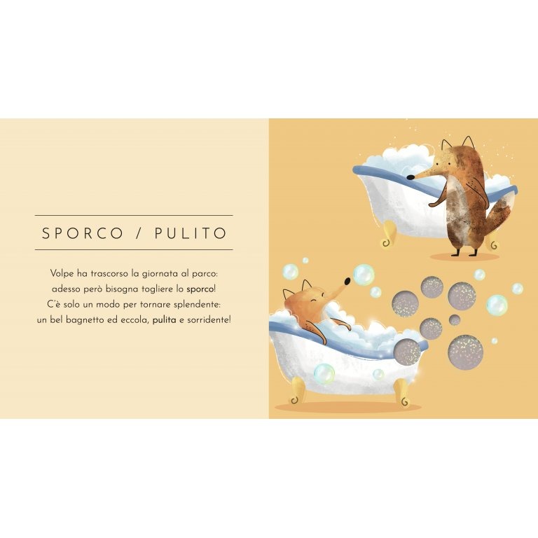 Grande-piccolo, sporco-pulito, vuoto-pieno… scopri tutti i concetti degli opposti seguendo le avventure della piccola volpe protagonista! Ogni pagina racchiude una sorpresa: un inserto di diverso materiale per sperimentare il mondo attraverso il tatto.