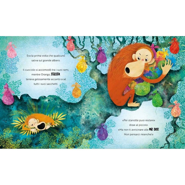 Orango è gelosissimo delle sue cose, e non lascia mai avvicinare nessuno a ciò che possiede. Finché, grazie all’amicizia, scopre che la condivisione è il regalo più bello.