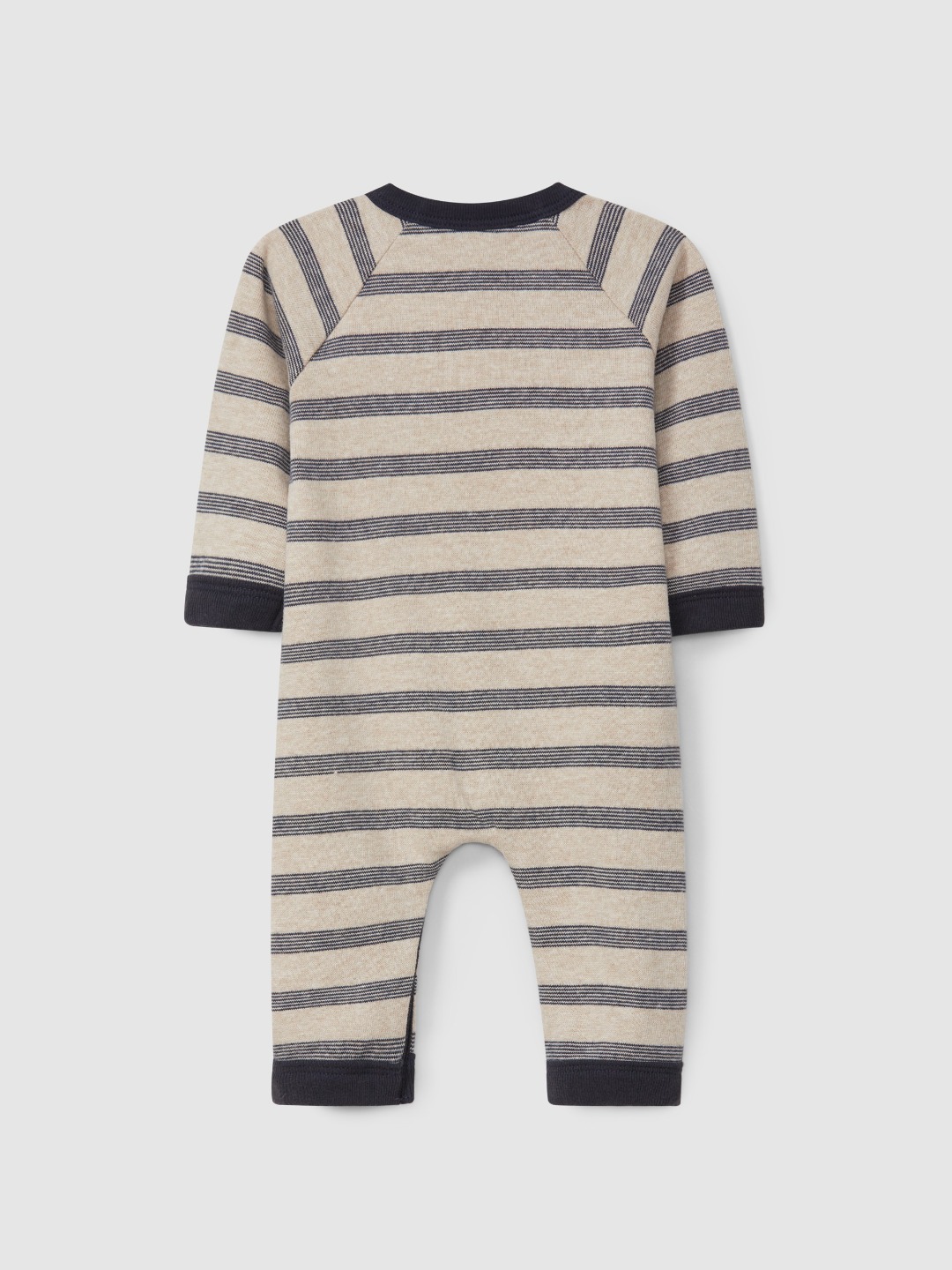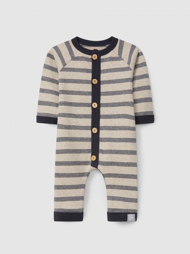 Morbida e calda tutina rigata in jersey di cotone 100% con dettagli in colore a contrasto. Si chiude con bottoni in legno a tutta lunghezza e bottoni automatici tra le gambe.
