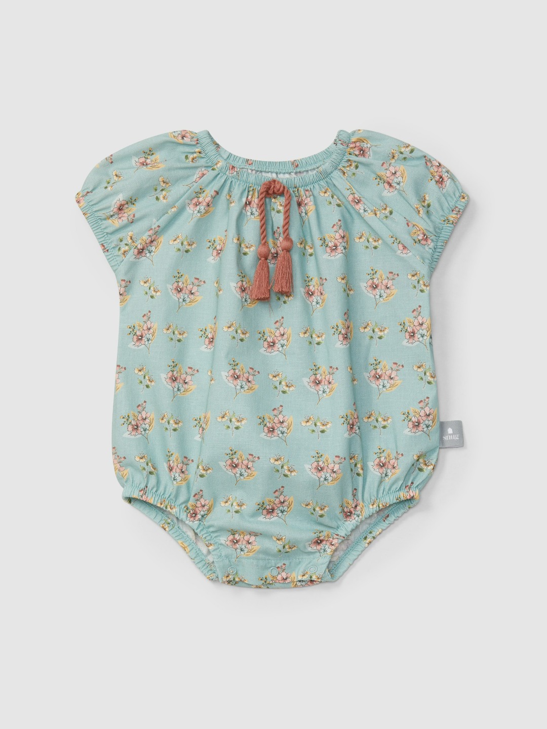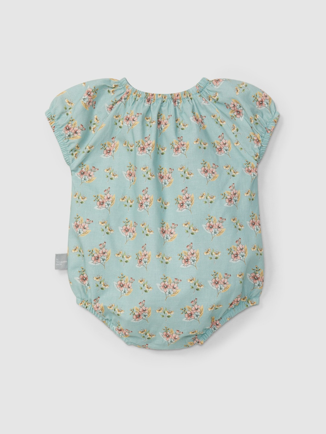 Shortie in tessuto fresco e confortevole con stampa floreale 100% cotone. Elasticità su collo, maniche e gambe per maggiore comfort e facilità di vestizione. Dettaglio di coulisse decorativa in colore a contrasto sul davanti. Chiusura con bottoni automatici tra le gambe.