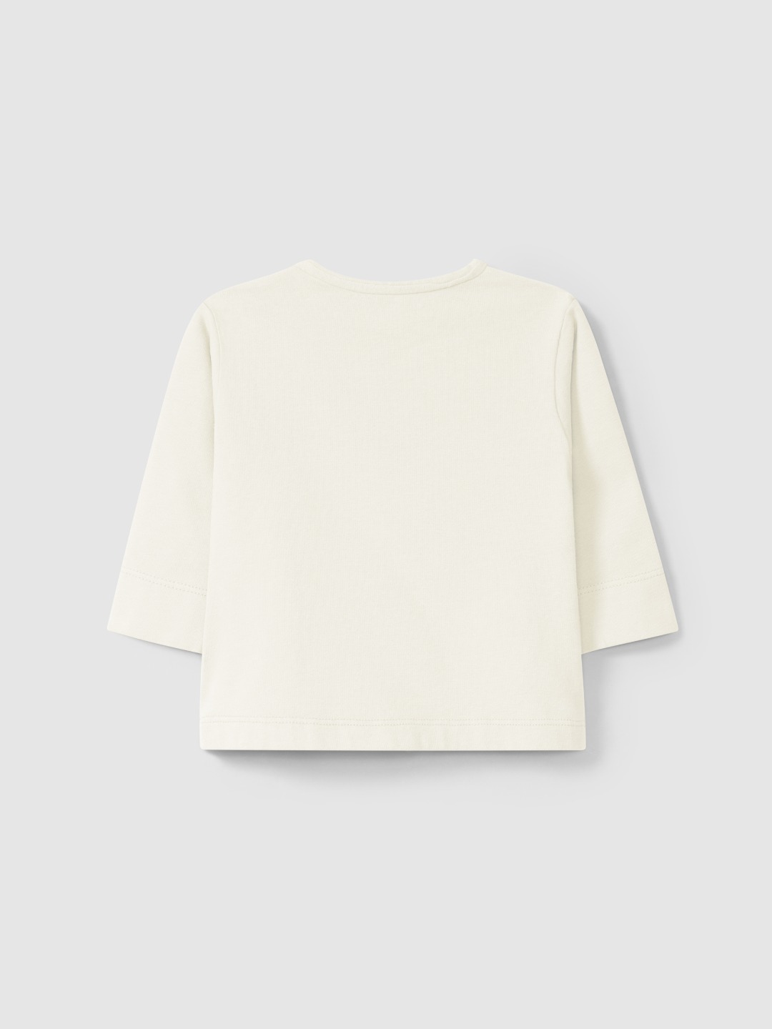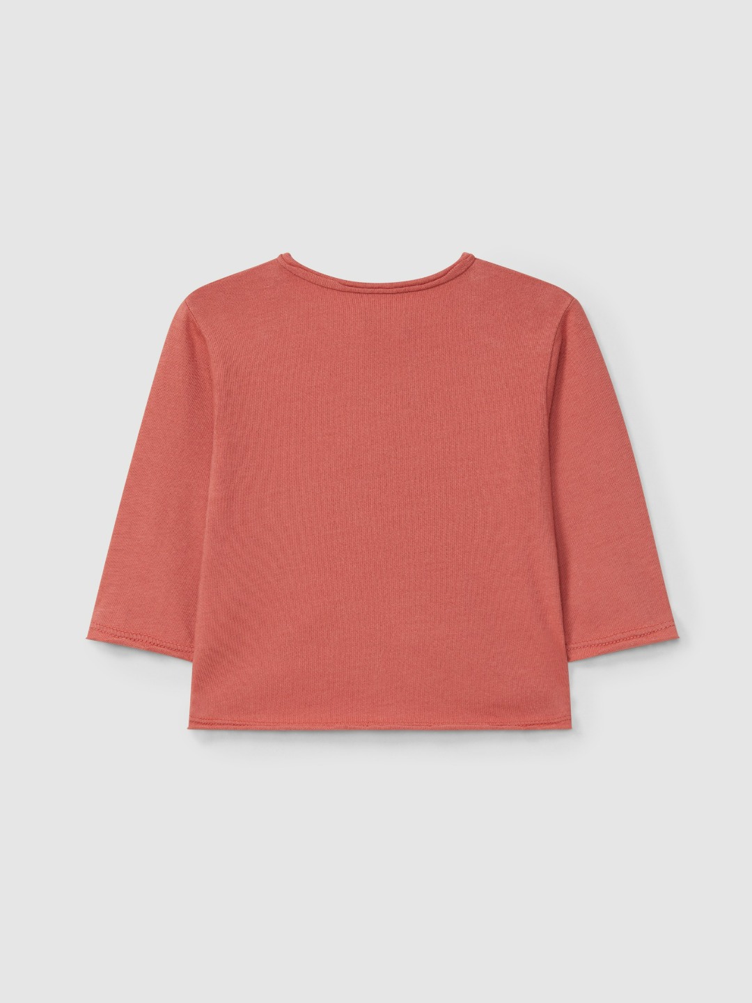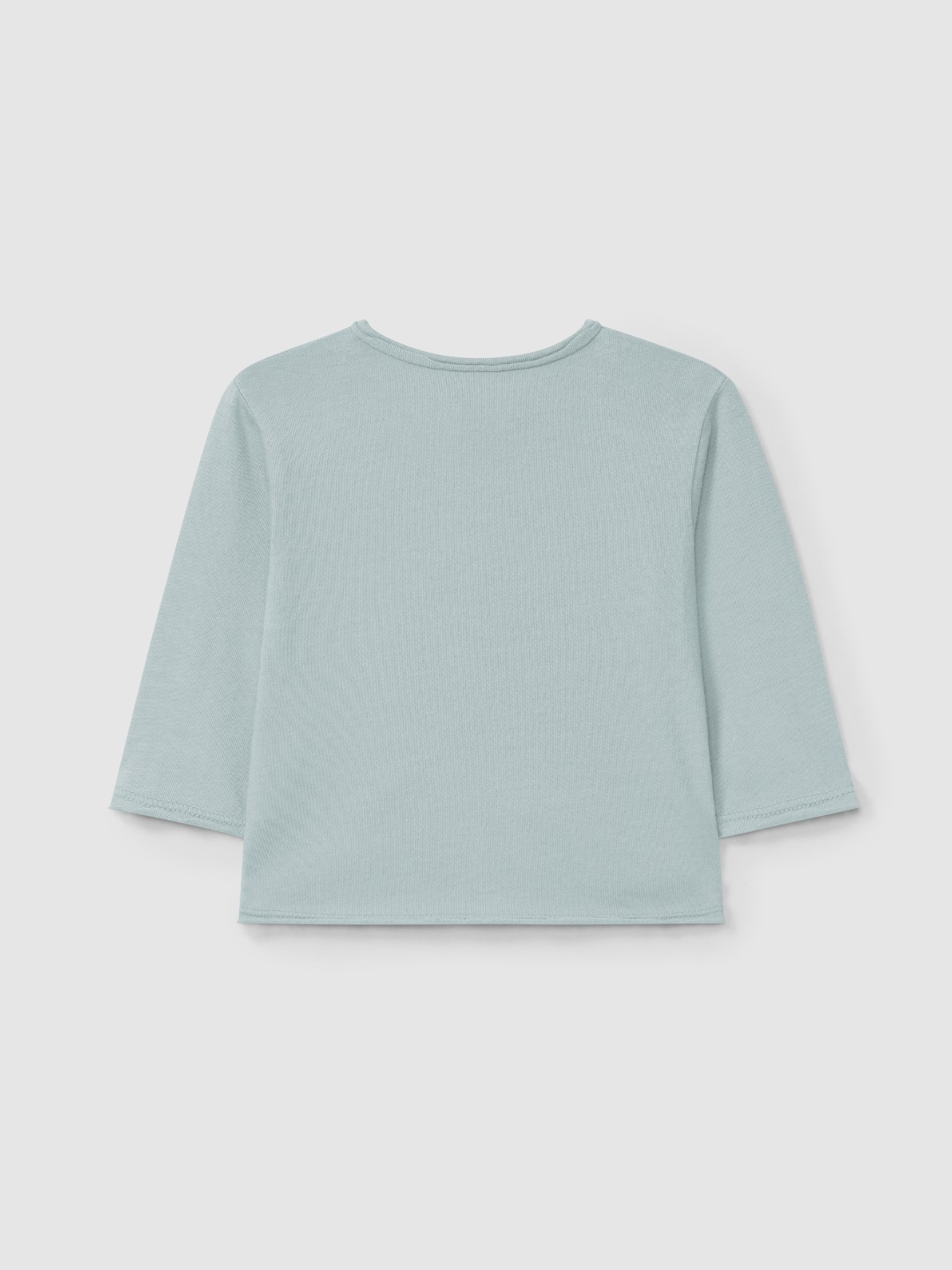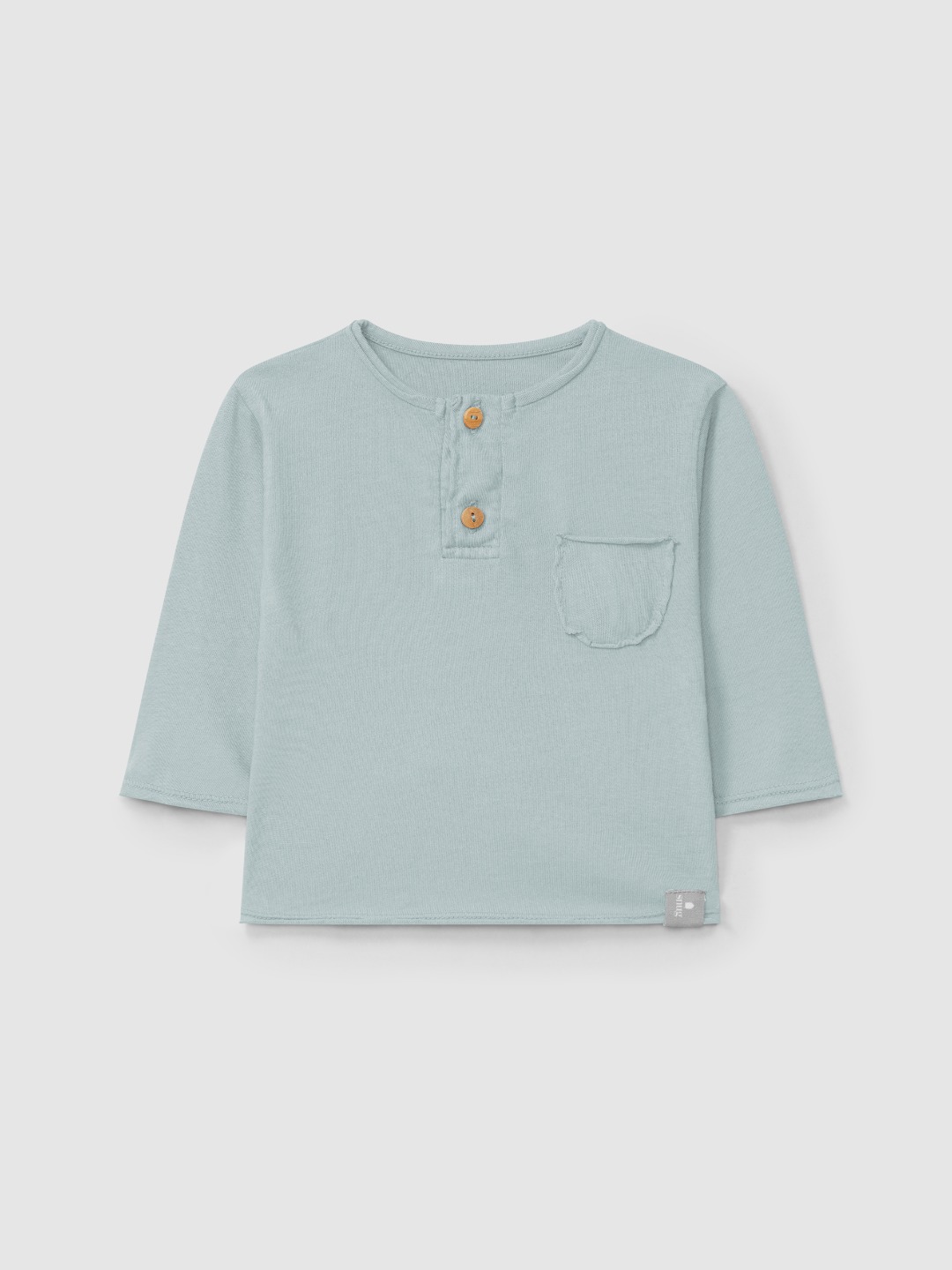 Maglia a maniche lunghe tinta unita in jersey di cotone riciclato e organico con dettaglio tasca funzionale sul davanti. Si chiude con bottoni in legno sul davanti.