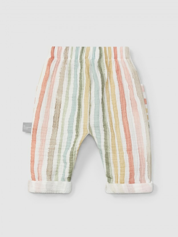 Pantaloni pull-up in garza di cotone 100% con stampa a righe multicolore. Bottoni decorativi in legno e coulisse. Tasche anteriori funzionali. La gamba può essere arrotolata su o giù per una maggiore durata.