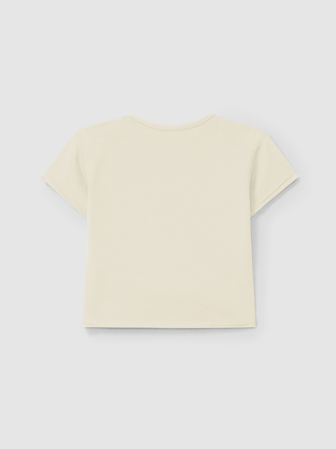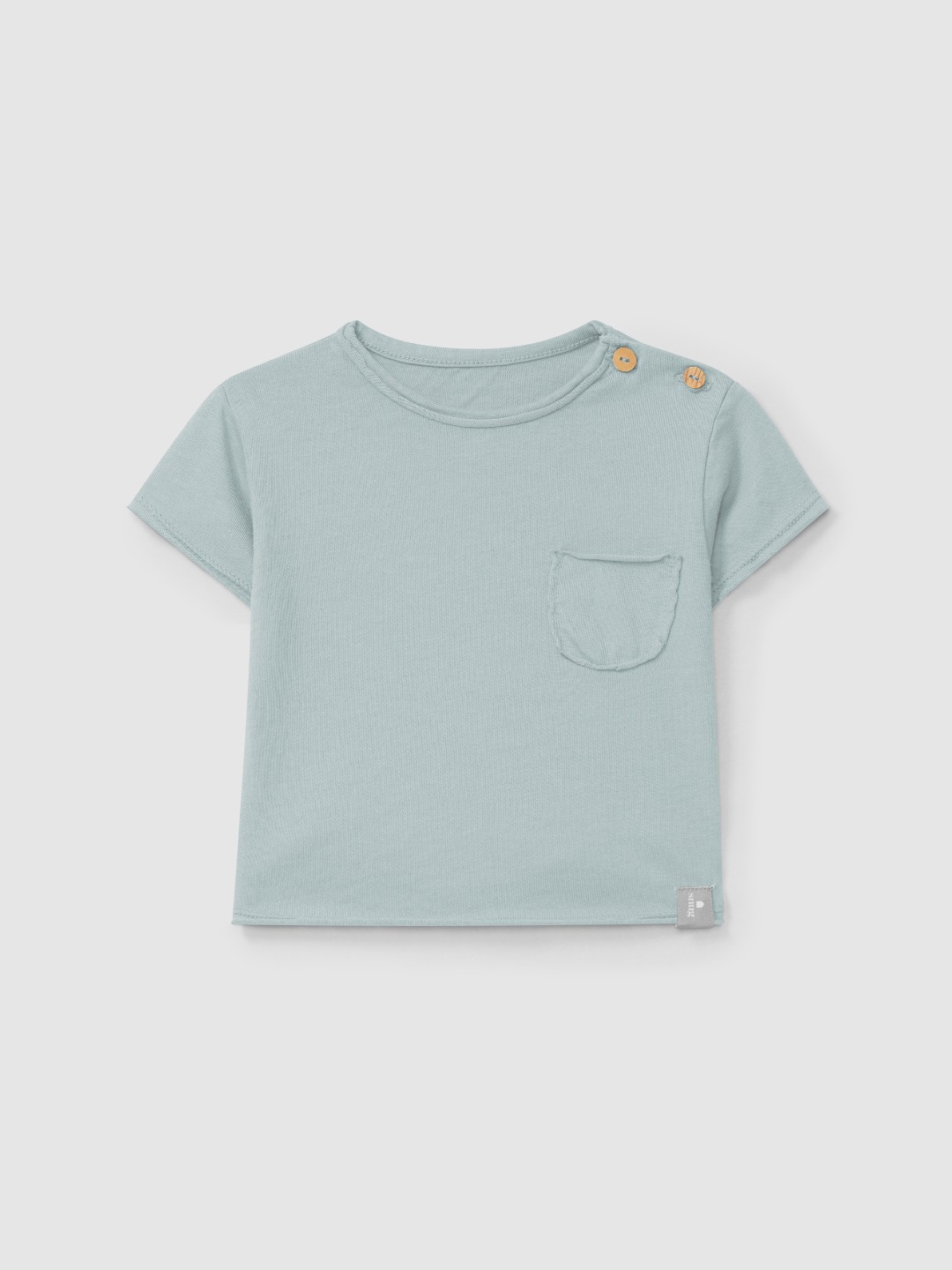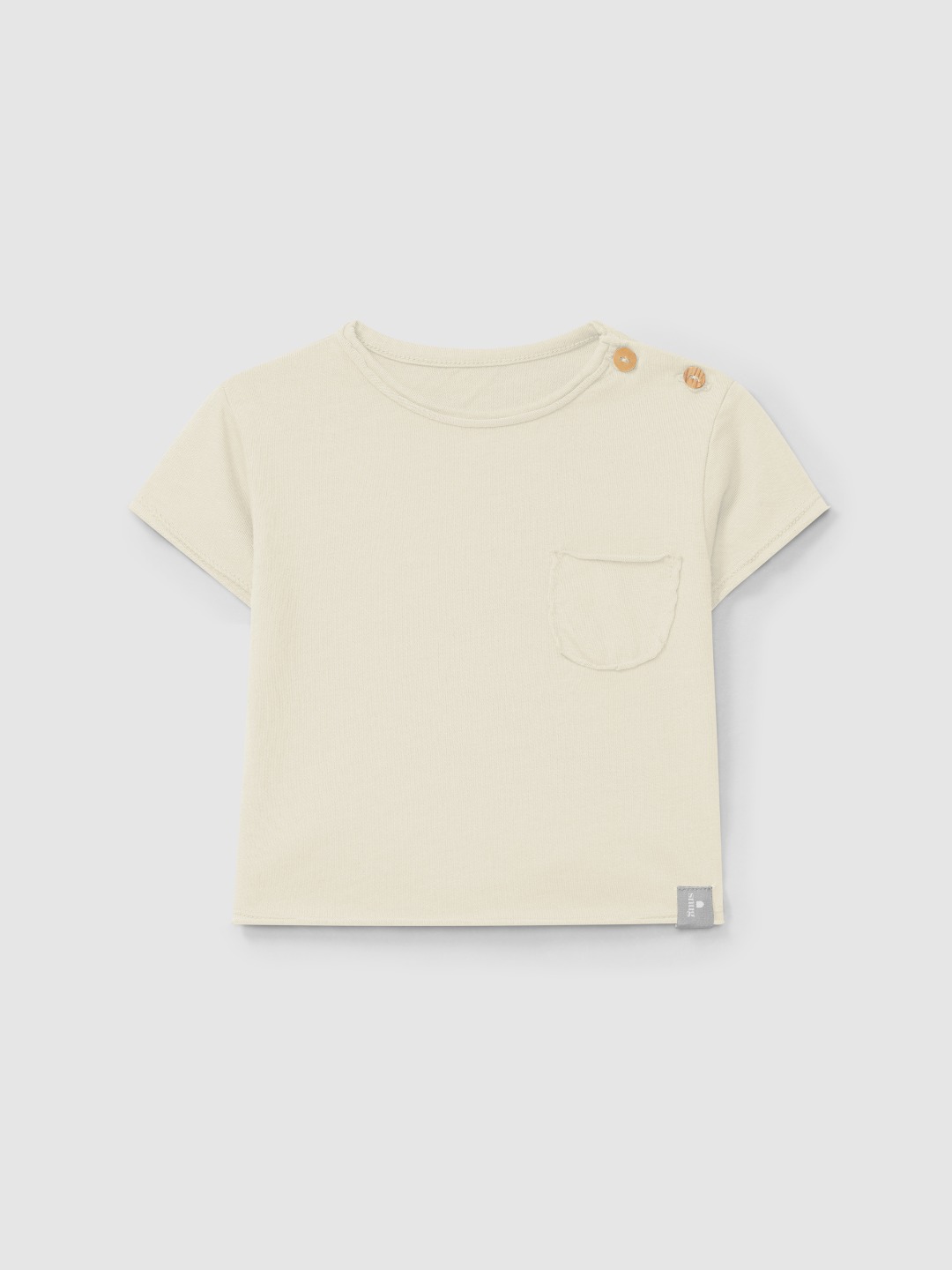 T-shirt semplice in jersey di cotone riciclato e biologico con dettaglio della tasca sul davanti. Chiusura con bottoni in legno sulla spalla.