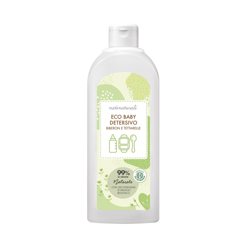 Detergente liquido ecologico per il lavaggio a mano di biberon, tettarelle, stoviglie e altri oggetti che possono venire a contatto con il bebè.
